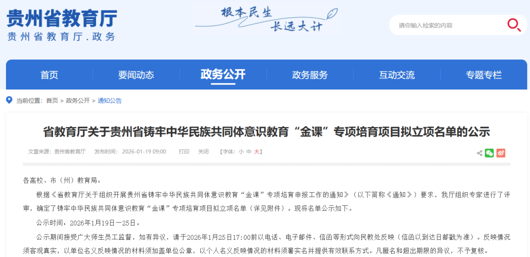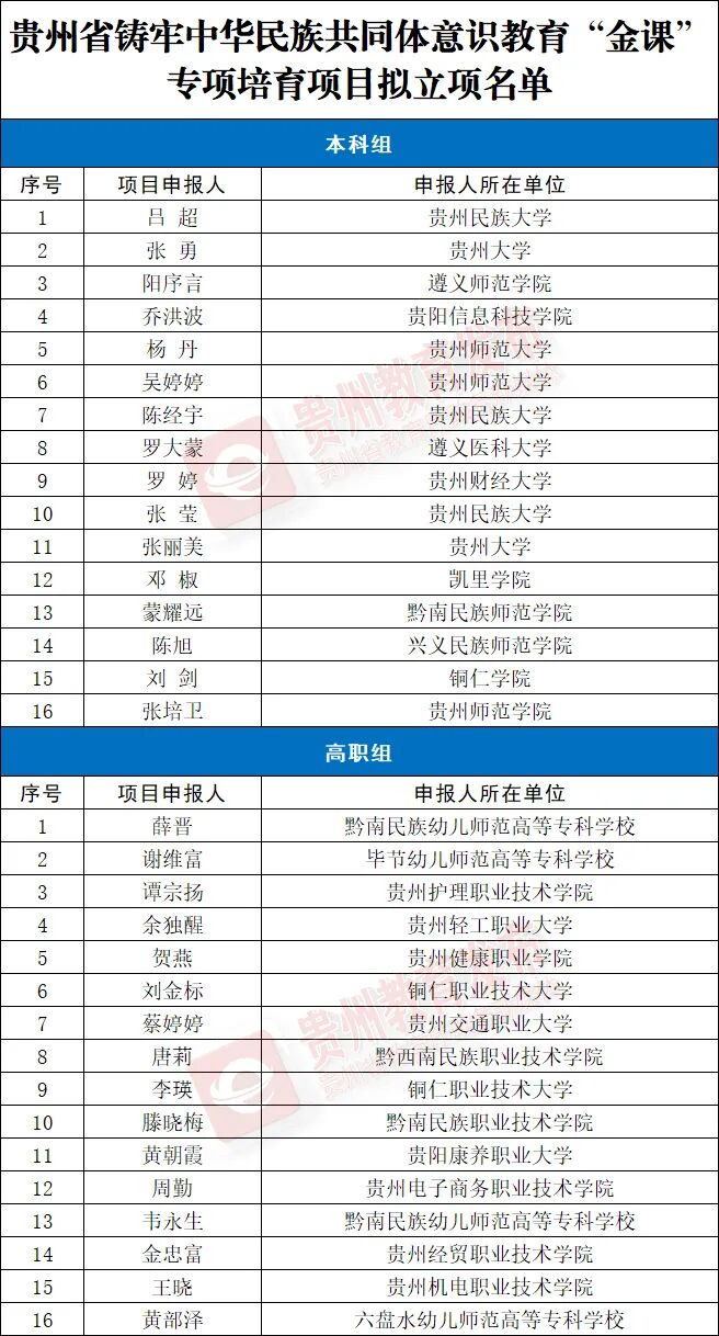 近日,省教育厅组织专家对各地各校申报的贵州省铸牢中华民族共同体意识教育“金课”专项培育项目进行评审,确定了拟立项名单,现进行公示。一起来看——